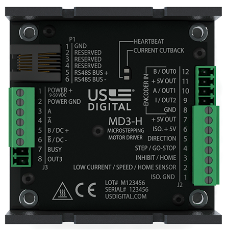 Unlike the MD2S, which uses jumpers and DIP switches for configuration, all configuration of the MD3 drive occurs over an RS485 serial port on P1. A USB to RS485 adapter (not included) is needed to connect a PC to the MD3. The serial port uses the Modbus RTU protocol. Modbus RTU is a simple, register-based command/response protocol. All MD3 settings such as phase current, microstepping, etc. are stored in thirty-two flash memory registers in the MD3. The MD3 User Guide gives full details on register read and write commands needed to configure the product. In addition to configuration, the serial port can also be used to send motion commands such as Move, Jog, Home, etc. so a host such as a PLC can control the MD3.