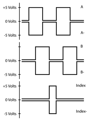 Single-Ended Output is the most basic kind of output on an encoder. Each channel only has one wire which provides a train of pulses alternating between 0 to 5 volts in relationship to ground. While it is the most common, it is inherently susceptible to electrical noise and the length of the cable is quite limited. Using a differential output will resolve both of those issues.