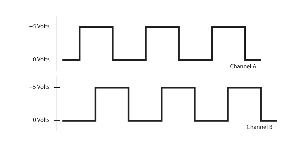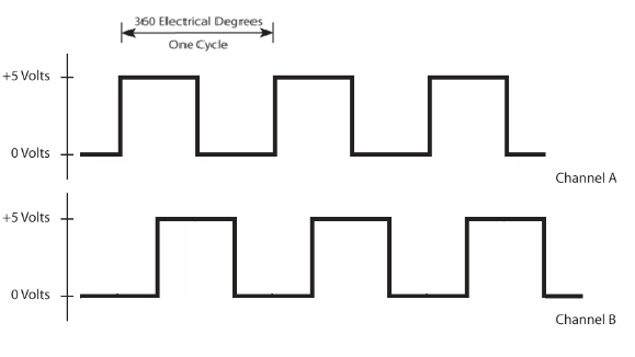 Quadrature is the most common digital incremental encoder output. It uses two channels (typically referred to as channels A and B) which are offset from each other by 90 electrical degrees. This output enables one to determine the direction of movement (by viewing which channel is leading the other) and allows for resolution multiplication—providing up to four times the CPR resolution.